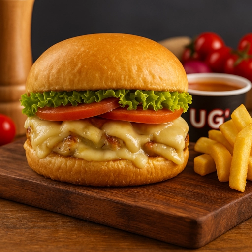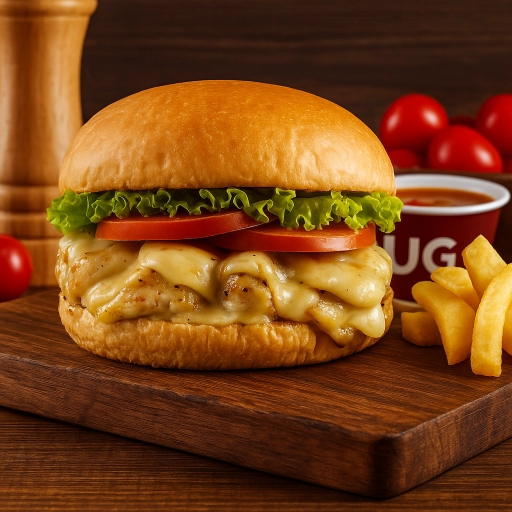 Hamburguer artesanal de frango com 120g, alface, tomate, mussarela e maionese. Acompanha um molho a escolha + batata fri... Ver completo