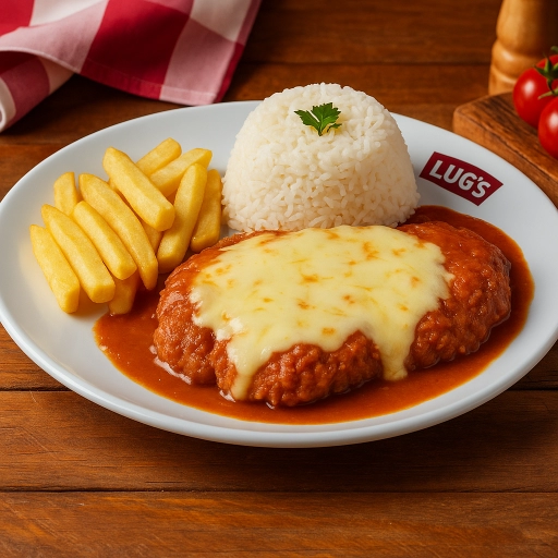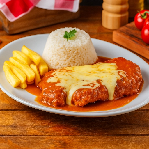 Parmegiana de Carne com Molho de Tomate Artesanal, Arroz e Batata Frita,