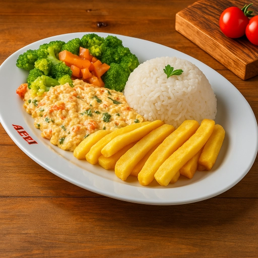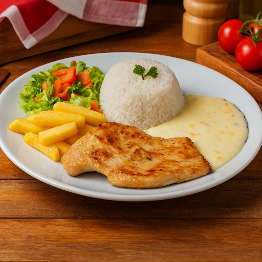 Delicioso filé de frango grelhado, arroz, creme de milho, salada e batata frita