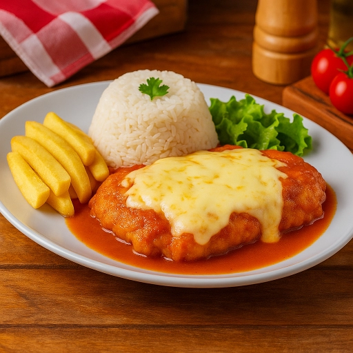 Parmegiana de frango ao molho de tomate artesanal, mussarela derretida, arroz e batata frita