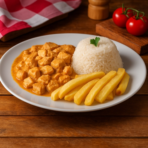 Arroz, batata frita e nosso delicioso strogonoff de frango.