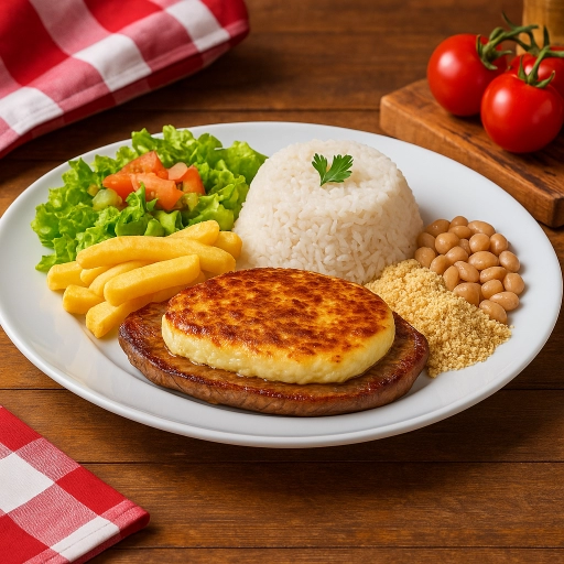 Bisteca suína grelhada, Arroz, feijão, batata frita, salada, ovo e farofa.