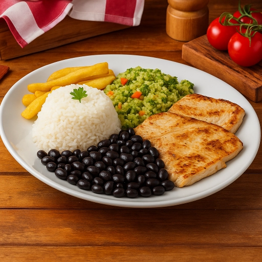 Filé de frango grelhado com legumes salteados na manteiga, arroz, feijão e batata frita