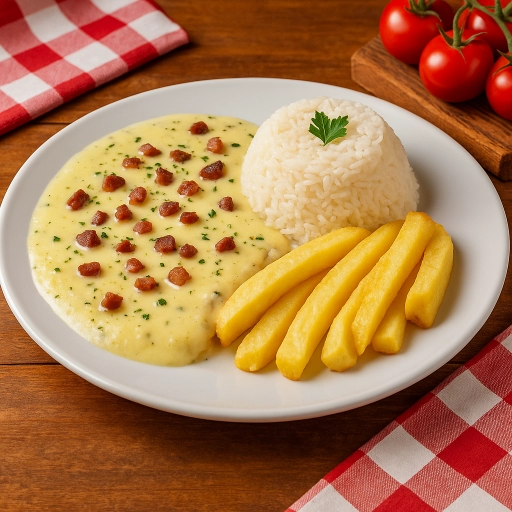 Delicioso filé de frango empanado com molho 4 formaggio, bacom e raspas de limão, arroz e batata frita