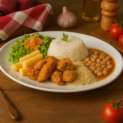 Arroz, feijão, salada, farofa, batata frita e um corte de frango a escolha (filé de peito, meio da asa ou coxinha da a... Ver completo