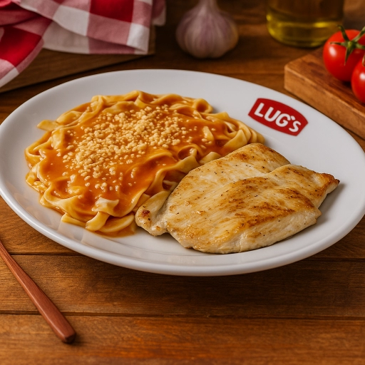 Massa fettuccine, molho de tomate artesanal, parmesão relado e um delicioso filé de frango grelhado