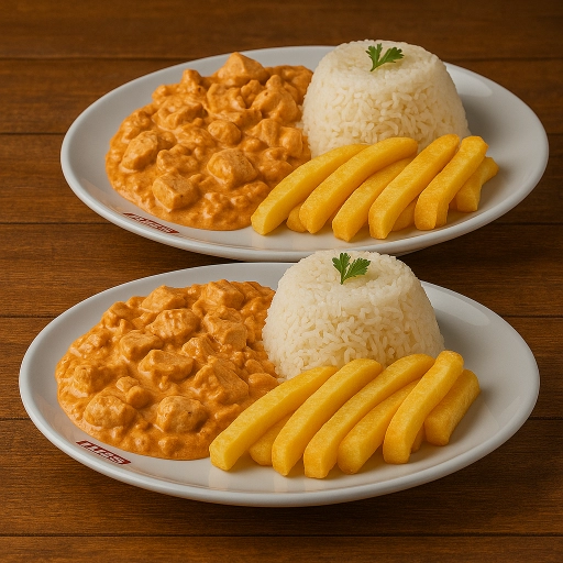 2 pratos do delicioso strogonoff de frango da casa com arroz e batata frita