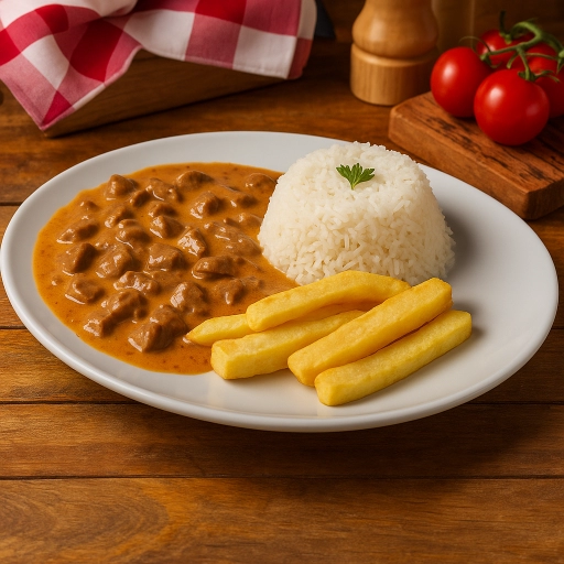 Arroz, batata frita e nosso delicioso strogonoff de carne